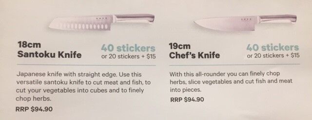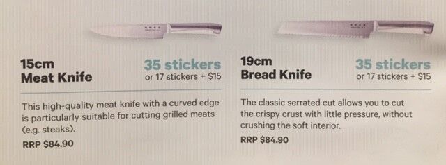 それにしても20ドルで1枚のステッカーでけっこうな買い物額が要求されますよね!例えば8㎝のベジタブルナイフでも25枚ということですから、計算すると500ドルのお買い物をしてやっともらえるというかんじです。