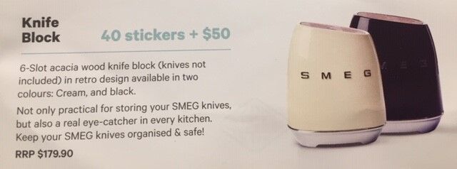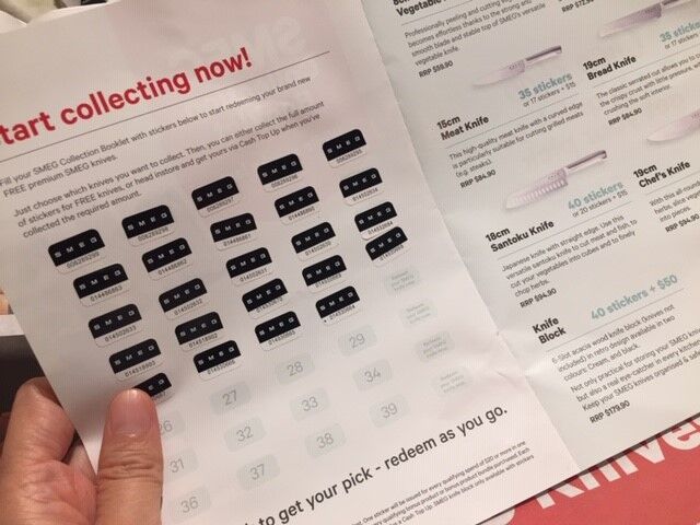 いま、NEW WORLDでは、20ドルの買い物で1枚もらえるステッカーを集めると、SMEGっていうブランドのナイフがもらえるキャンペーンをやってるみたいですよ!